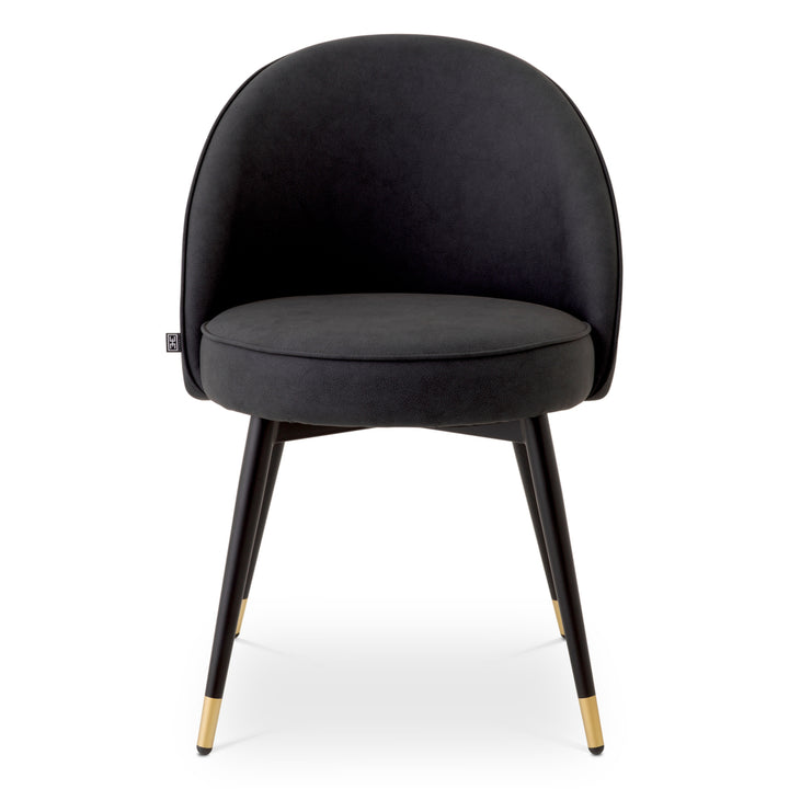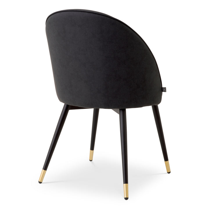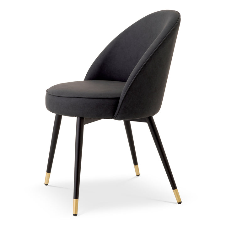 Elke stoel wordt gekenmerkt door een zitting en rugleuning in een grijze bekleding van kunstleer met biezen, taps toelopende zwarte poten en messing doppen