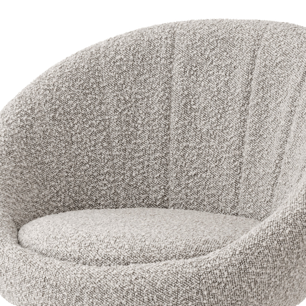 Een elegante gestoffeerde bouclé-grijze curve ontmoet een strak geborsteld messing draaibare voet voor een organische eetkamerstoel met een moderne uitstraling. Ontdek een ergonomisch, eigentijds ontwerp dat zich aanpast aan het menselijk lichaam voor maximaal comfort met de O'Neill Eetkamerstoel. Verticale knoopstiksels en een draaibare voet completeren het verleidelijke profiel van deze stoel.
