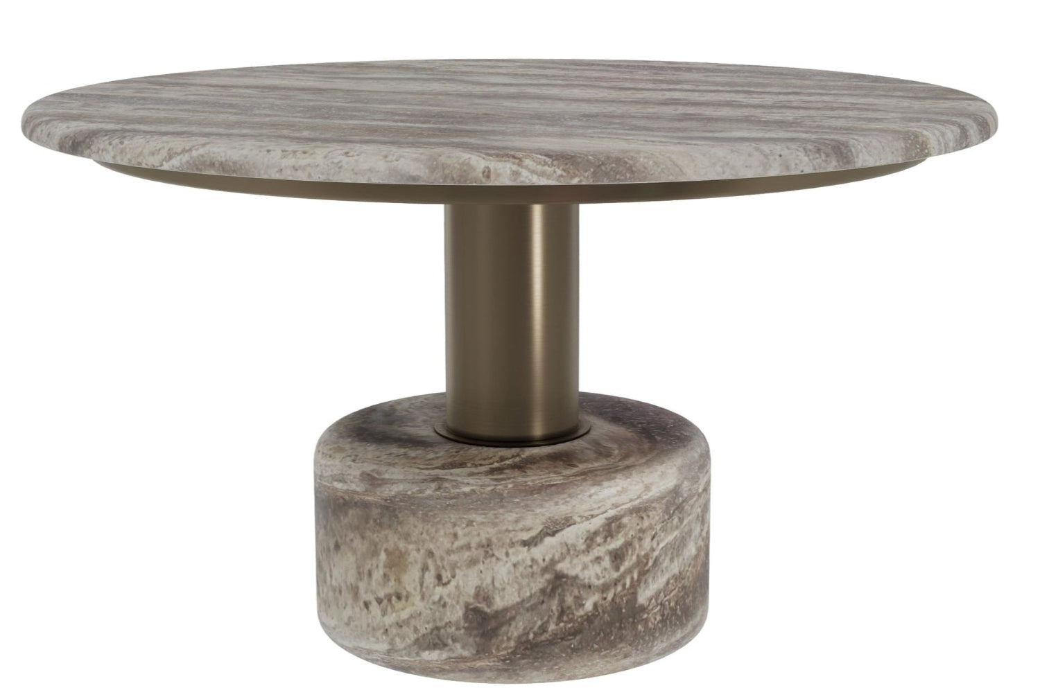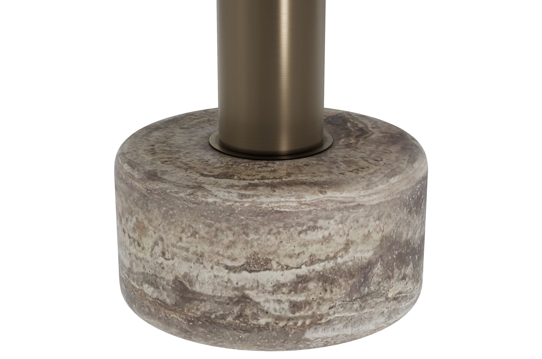 Het onderstel is gemaakt van geborsteld bronskleurig staal en vormt een elegant tegenwicht aan het warme natuursteen. Deze combinatie creëert een harmonieuze balans tussen robuustheid en verfijning, geschikt voor zowel moderne als klassieke interieurs.