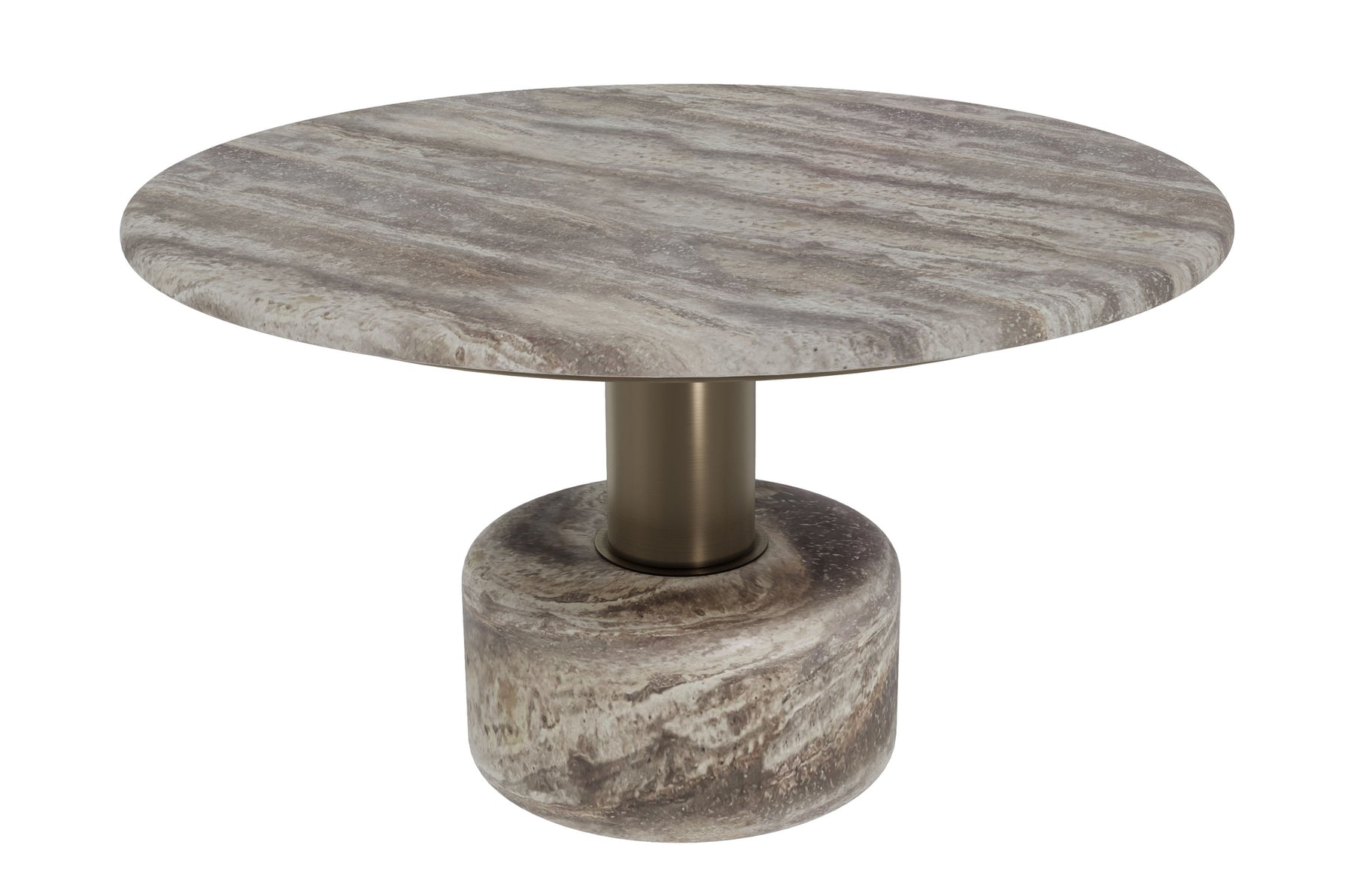 Het ronde blad is vervaardigd uit grijs travertin, een natuurlijk kalksteen met karakter. De unieke structuur, fijne aders en subtiele kleurschakeringen zorgen ervoor dat geen enkele tafel hetzelfde is. Kleine opgevulde scheurtjes zijn geen imperfecties, maar juist authentieke kenmerken van dit edele materiaal.
