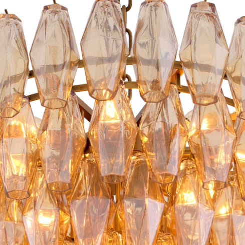 Deze prachtige taps toelopende kroonluchter met antiek messing afwerking is voorzien van ruitvormige buizen van amberkleurig glas die licht doorlaten, waardoor een fascinerend lichtspel ontstaat. Ook verkrijgbaar in een grote versie. Groepeer elkaar voor een boeiende sfeer.