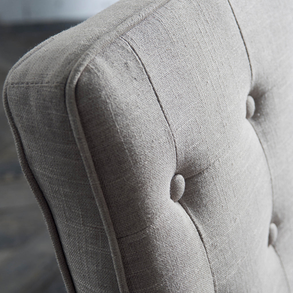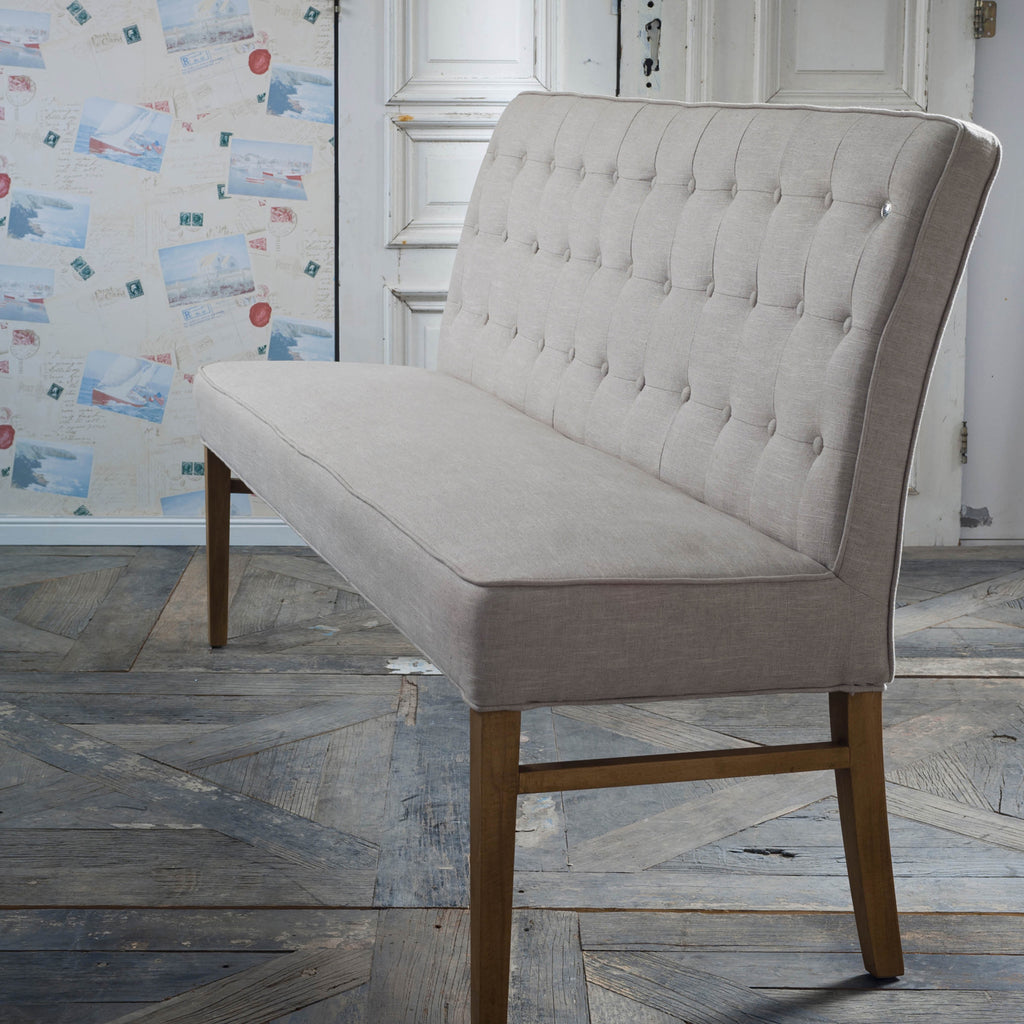 Diese bequeme, gepolsterte Leinenbank ergänzt wie die Keith Lowback Wing Bench den Cape Breton Chair. Es ist eine schöne Idee, diese Cape Breton Bank auf der einen Seite des Tisches und drei Cape Breton Chairs auf der anderen Seite zu platzieren. Der Haken an der Rückseite ist praktisch für Ihre Handtasche, sodass Sie Ihre Luxustasche nicht mehr auf dem Boden abstellen müssen.