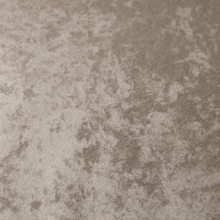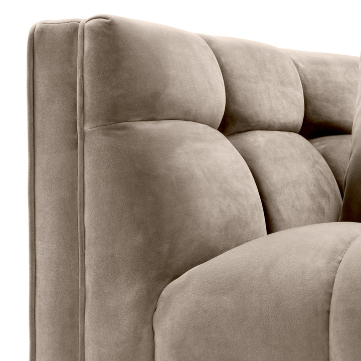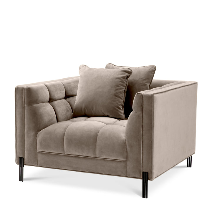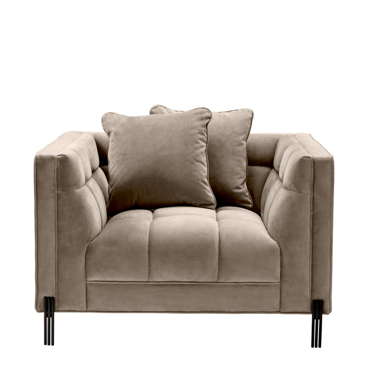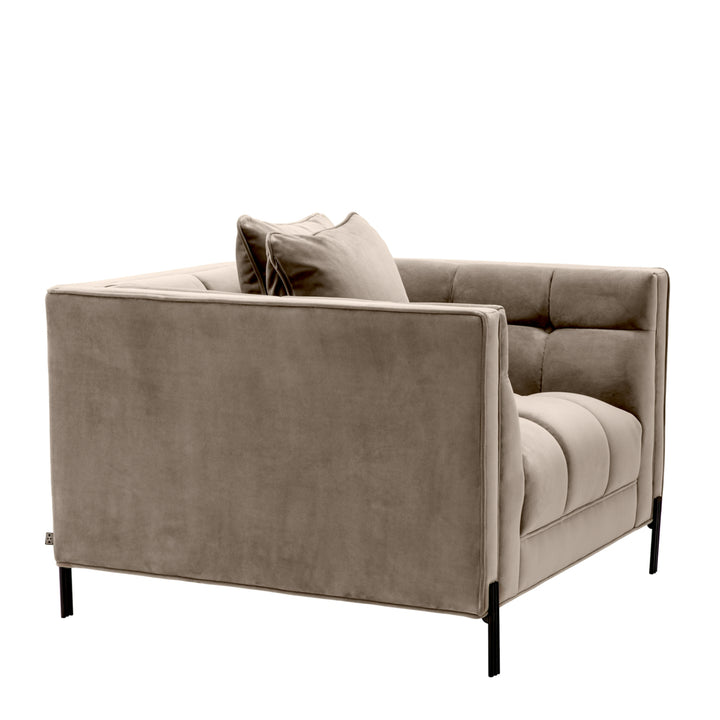 With a T-shape, the backrest forms a whole with the armrests. This elegant modern armchair comes in a tufted upholstery in soft Savona greige velvet, with two square decorative cushions. Black finished legs add extra glamour to the luxurious look