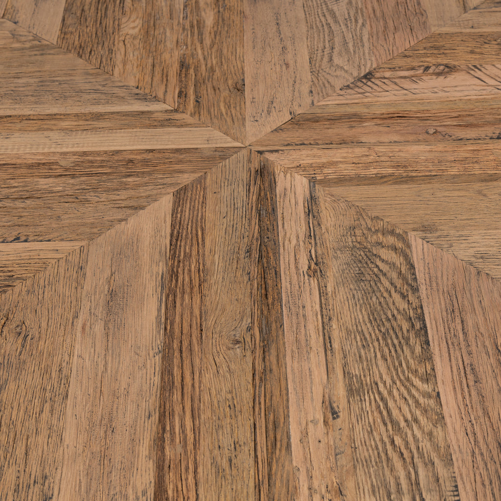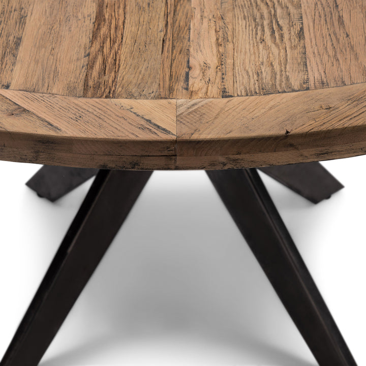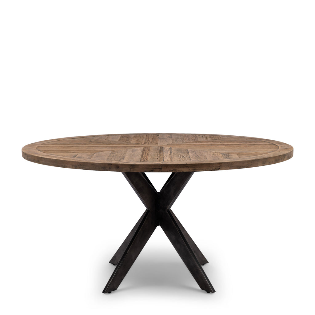 De Falcon Crest Eettafel is een prachtige ronde eettafel met een diameter van 1,5 meter. Het tafelblad is gemaakt van ingelegd, hergebruikt eikenhout.