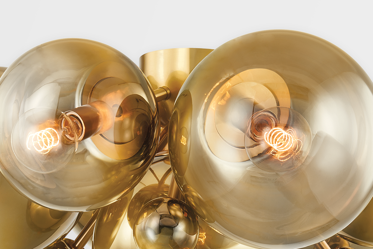 Deze showstopper bestaat uit clusters van Ombre glazen bollen in verschillende maten. Elke bol gaat over van messing naar helder en het Ombre-lichteffect is gewoonweg verbluffend. Het doet sommigen denken aan gouden luchtbellen van magische glaskristallen. De combinatie van heldere kristallen kralen en gloeiend messing creëert een betoverende licht van deze flush Mount. Kyoto zal het middelpunt zijn in elke ruimte.